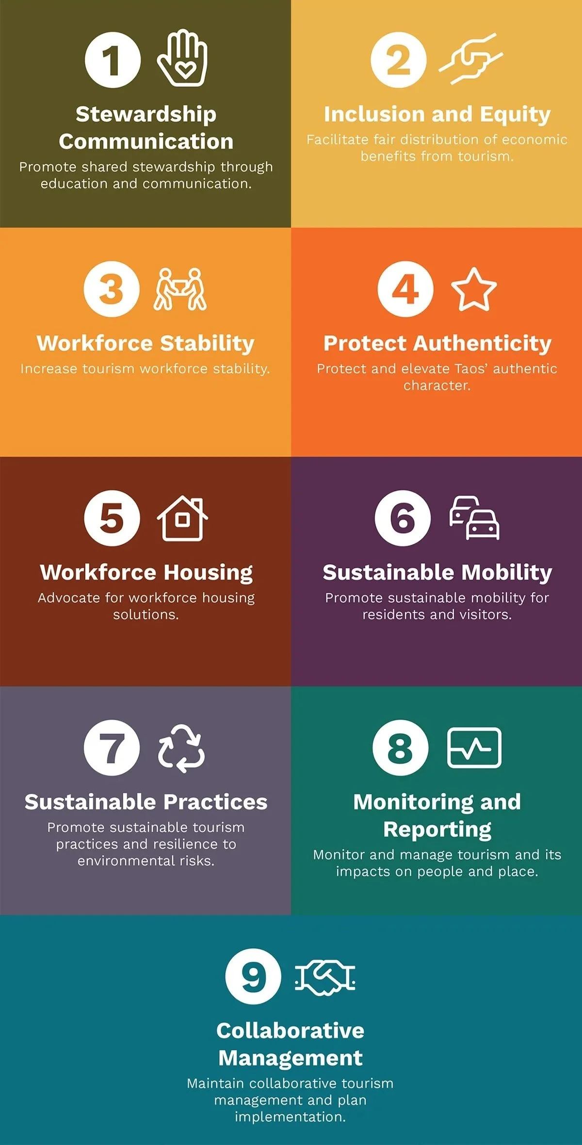 The Taos Destination Stewardship Goals are a framework to guide cross-sector collaboration and action towards maintaining the livability and integrity of the many communities in Taos.