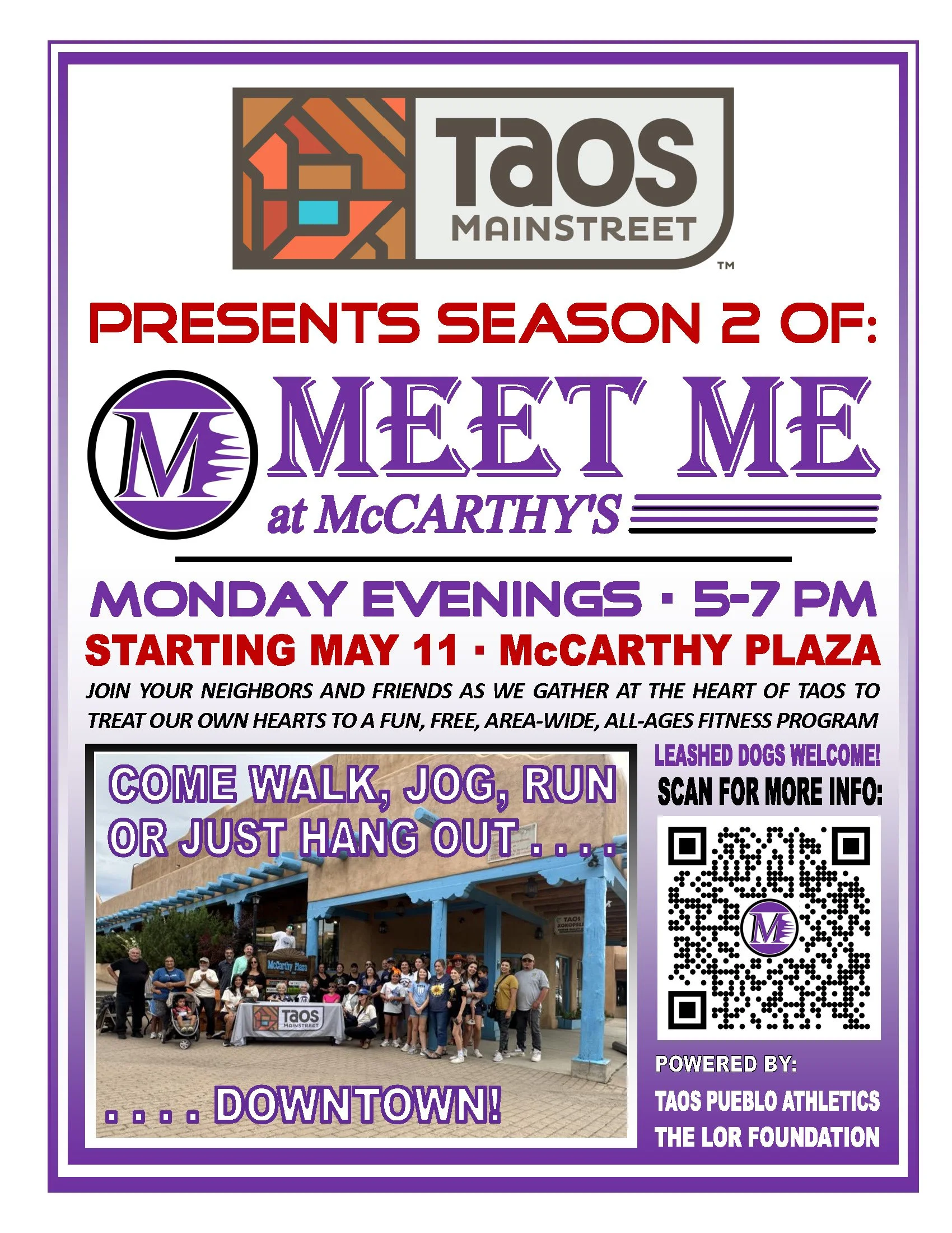 Meet Me at McCarthy's is a free, inclusive weekly event — open to everyone, at any pace. Walk, jog, run or just hang out. There is a 1, 2, or 3 mile loop through the plaza district. Join your neighbors and friends as we gather at the heart of Taos to treat our own hearts to fun, free, area-wide, all-ages fitness program.
